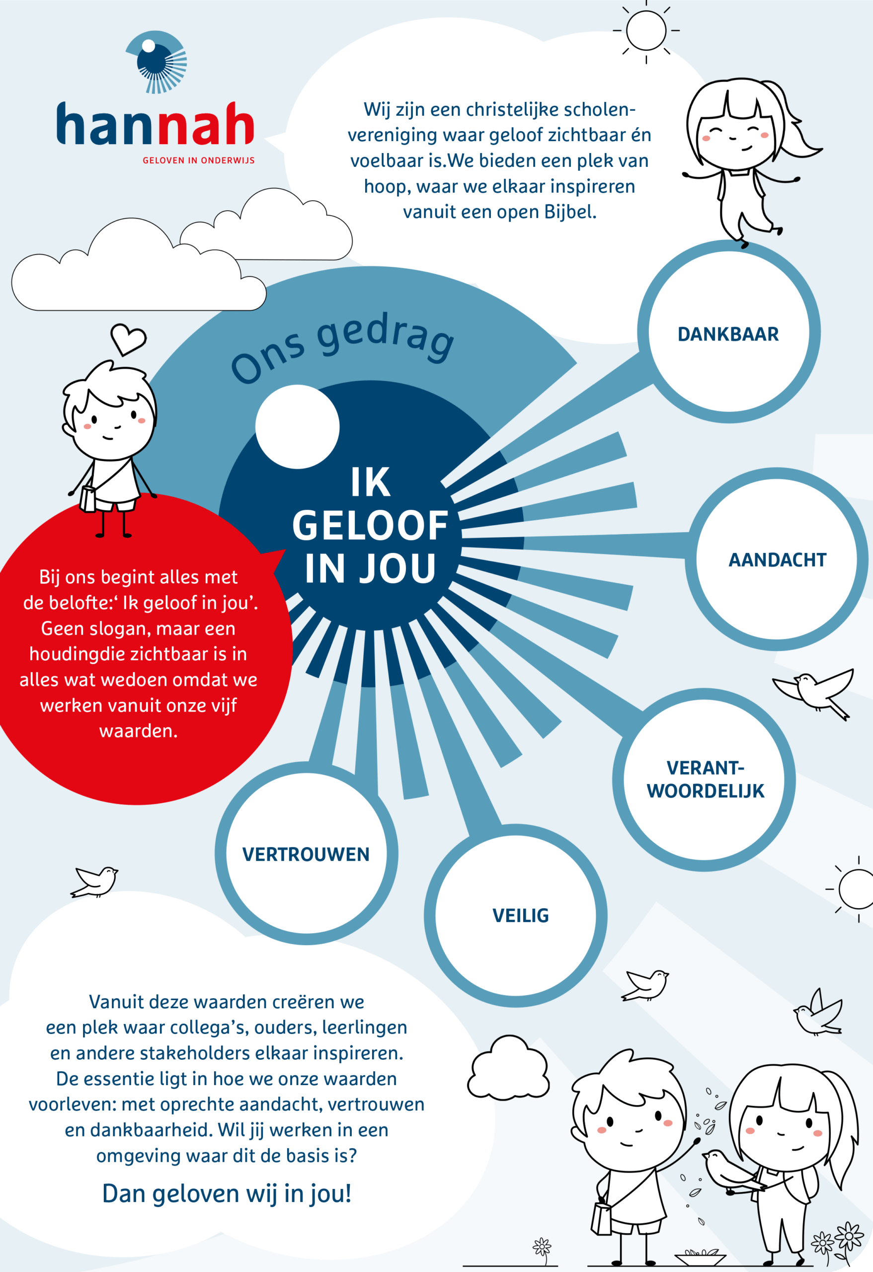 Bij Scholengroep Hannah geloven we dat ieder kind door God uniek is gemaakt. Iedere leerling heeft eigen talenten en mag ontdekken wie hij of zij is.